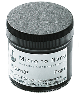 EM-Tec CHT37 is an unique carbon filled inorganic silicate adhesive, especially developed for high temperature applications up to 2000°C . The fine graphite flakes are fully mixed with water based silicate solution. It is a one component system without any VOC’s. EM-Tec CHT-37 is ideally suited use with heating stages used with systems such as SEM, FIB, SIMS, AUGER or XPS (ESCA). It is also most suitable for heating experiments and high vacuum applications where electrical and thermal conductivity are needed